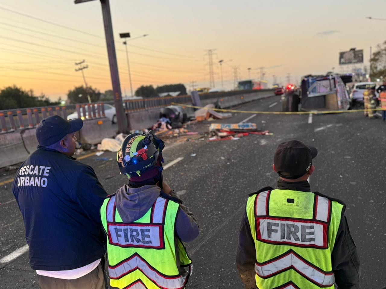 Tras recibir el reporte de una volcadura múltiple en la autopista México-Pachuca, a la altura del frontón de la colonia San Pedro Xalostoc, integrantes de las tres áreas de emergencia -Bomberos, Prehospitalaria y Rescate Urbano- se trasladaron de inmediato para atender el percance.