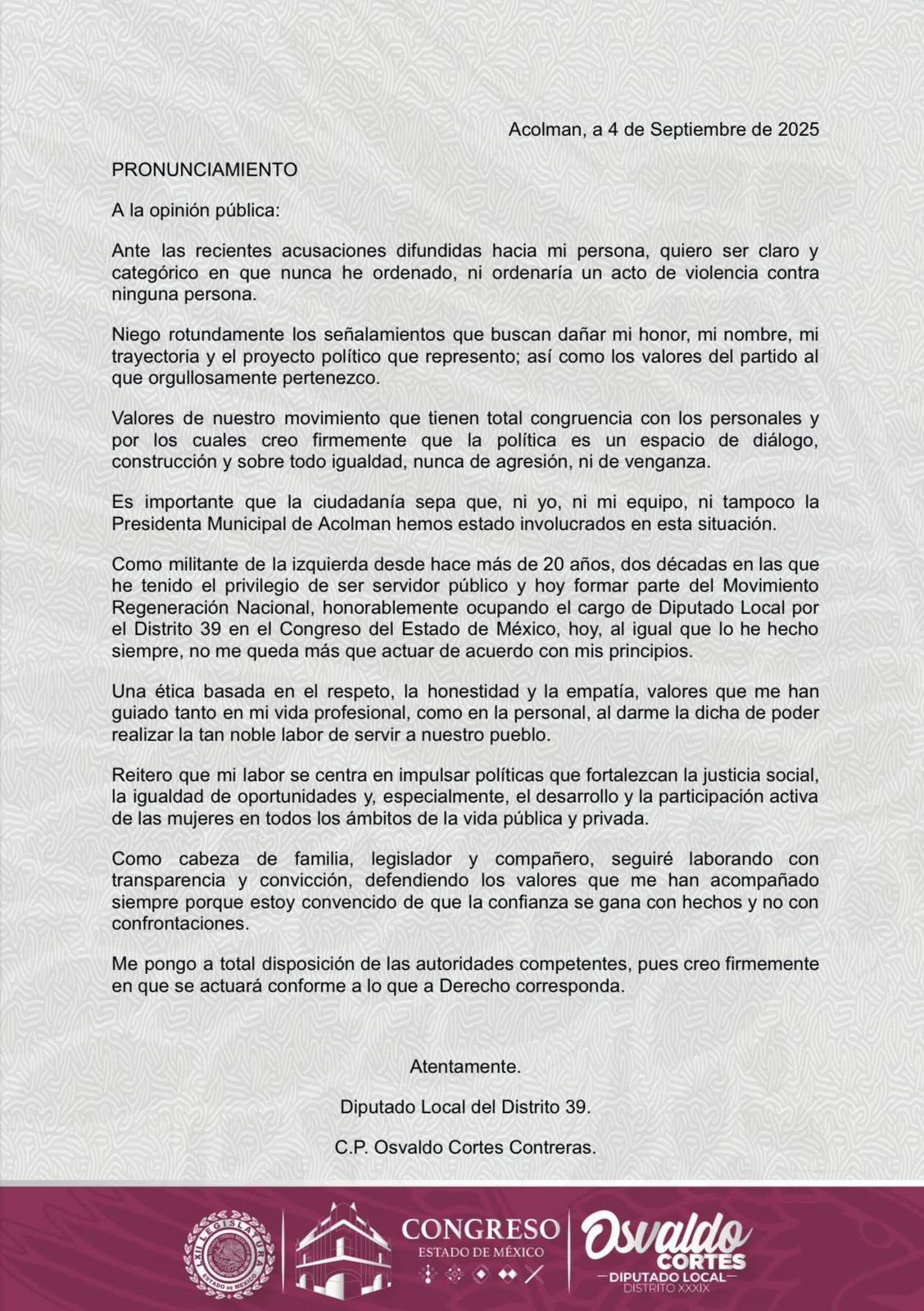 El legislador indicó que tanto su chofer como la presidenta municipal de Acolman, #BlancaGuadalupeSánchezOsorio, también fueron señalados, lo cual —afirmó— ha afectado la reputación de sus familias. Informó además que trabaja con su equipo legal para interponer una denuncia por lo que considera acusaciones sin fundamento.