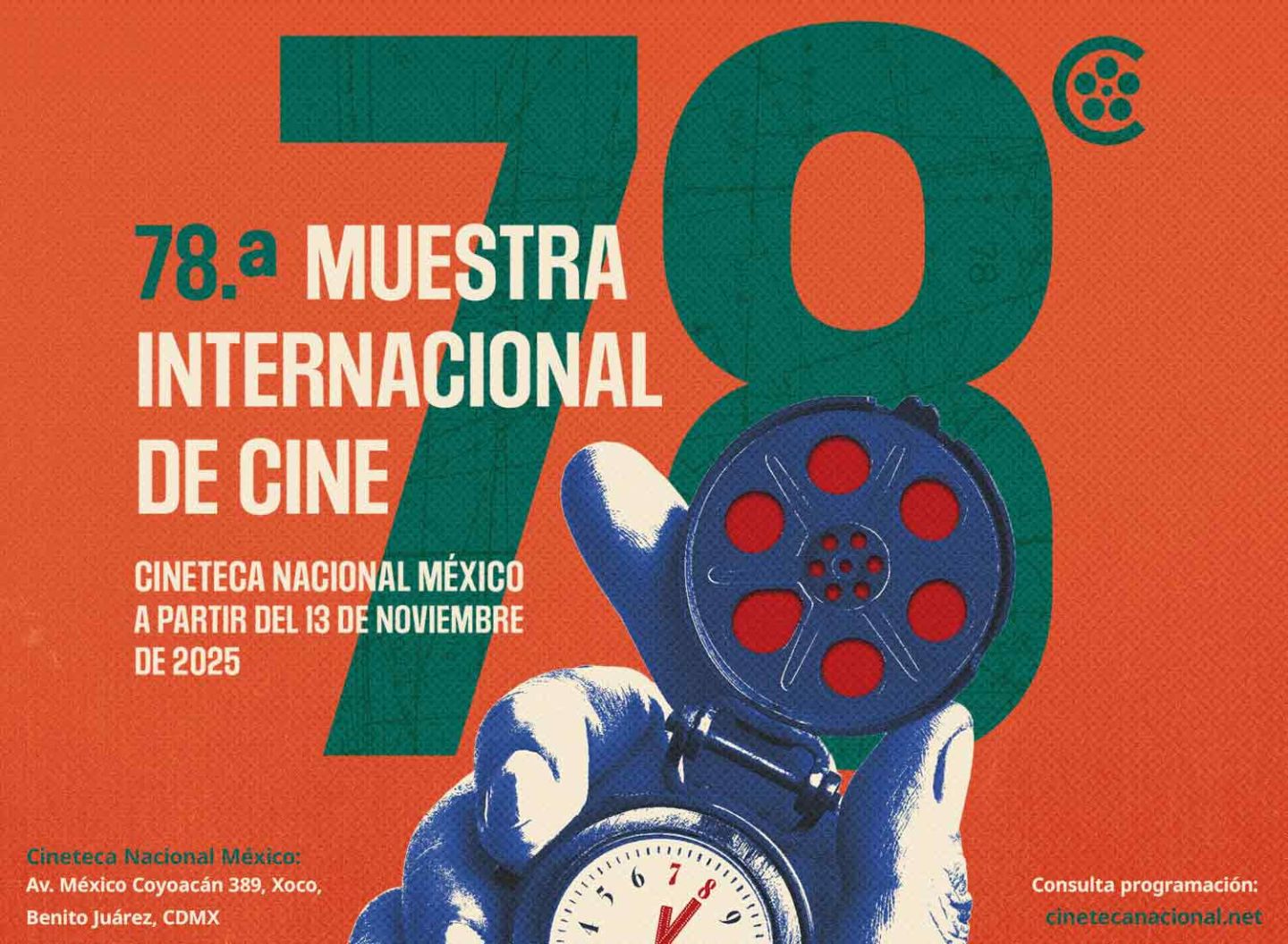 La 78 Muestra Internacional de Cine se llevará a cabo del 13 al 30 de noviembre en la Cineteca Nacional México, del 21 de noviembre al 11 de diciembre en Cineteca Nacional de las Artes y Cineteca Nacional Chapultepec. Cumpliendo una vez más su compromiso con la difusión del arte audiovisual en la Ciudad de México y del resto del país, la programación también llegará al Centro Cultural Universitario CCU-UNAM, el Museo Universitario del Chopo UNAM, el Centro Cultural Jaime Torres Bodet del IPN y posteriormente en el interior de la República a través de Circuito Cineteca.