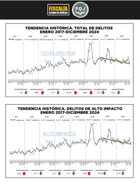 La tendencia histórica registrada en el año en el Edomex, muestra que hubo menos delitos y una notable reducción en los de alto impacto, lo que incide directamente en la disminución de los índices de violencia en la entidad