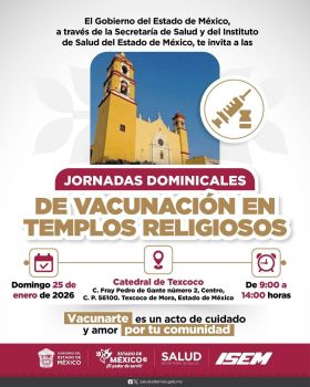 Macarena Montoya Olvera, Secretaria de Salud estatal, informó que en coordinación con el Gobierno federal, este domingo 25 de enero se aplicará jornada de vacunación en la catedral de Texcoco de 9 a 14 hrs.
