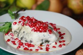Es un platillo de temporada que destaca en la Región de los Volcanes, son Atlautla, Amecameca, Ayapango, Ecatzingo y Ozumba, los principales productores de nuez de Castilla, ingrediente principal de este guiso.