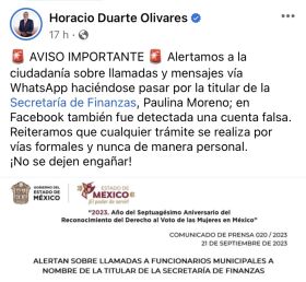 La Secretaría presentará una denuncia ante la Fiscalía General de Justicia del Estado de México, se reitera que los trámites ante la Secretaría de Finanzas se realizan por vías formales.