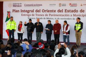 Desde la Mañanera del Pueblo la presidenta de México Claudia Sheinbaum entregó los Trenes de pavimentación a los municipios de Ixtapaluca, La Paz y Texcoco