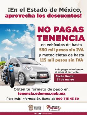 La Secretaría de Finanzas del Estado de México amplía el subsidio a la tenencia de vehículos de 400 mil a 550 mil pesos más IVA