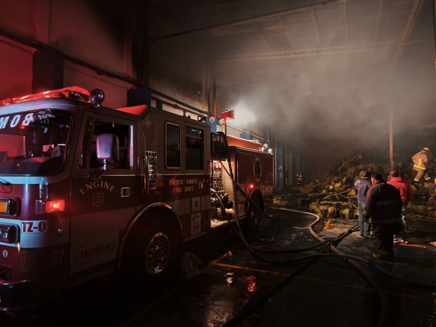 Tezoyuca, Estado de México; 08 de enero de 2026.–Elementos de Protección Civil y Bomberos de Tezoyuca acudieron este jueves en apoyo al municipio de Acolman para atender un incendio registrado en una bodega de pacas de alimento (zacate) para animales, ubicada sobre la Carretera Federal Lechería–Texcoco, a la altura del kilómetro 35.