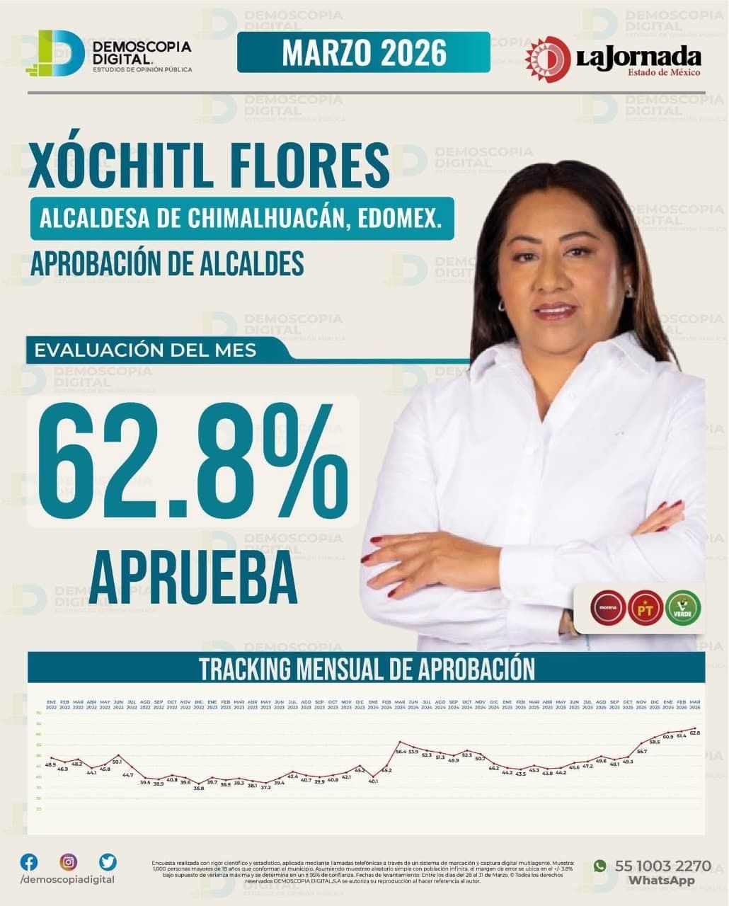 La presidenta municipal de Chimalhuacán, Xóchitl Flores Jiménez, se ubicó en el lugar ocho del Ranking de Aprobación de Alcaldes del Estado de México correspondiente a marzo de 2026, con un nivel de respaldo ciudadano de 62.8%, de acuerdo con la medición de la empresa Demoscopia Digital, la cual diseña y opera instrumentos de mercado y estudios políticos.